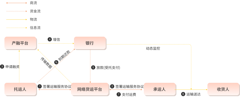 货主运费贷是平台合作资金方基于物流公司的货运订单、运输物流、结算资金流等信息,通过平台为物流公司贷前准入筛选、贷中持续性风险监测、贷后在途货物控制等措施,为具有运费融资需求的现结汽运物流公司提供在线融资服务